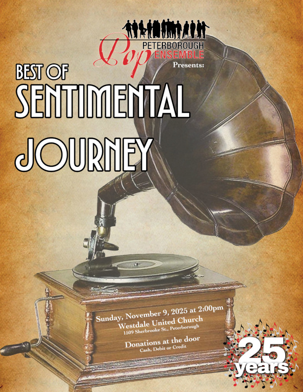 Step back in time with an enchanting afternoon of music from the 20s, 30s, and 40s. From the lively rhythms of the jazz age and the golden era of swing to the heartfelt ballads that carried a generation through wartime, this concert celebrates the timeless melodies and unforgettable charm of a remarkable era in music history. Come join the Peterborough Pop Ensemble at Westdale United Church at 2pm on Sunday Nov 9, 2025, for the “Best of Sentimental Journey”, and an extraordinary walk down memory lane.